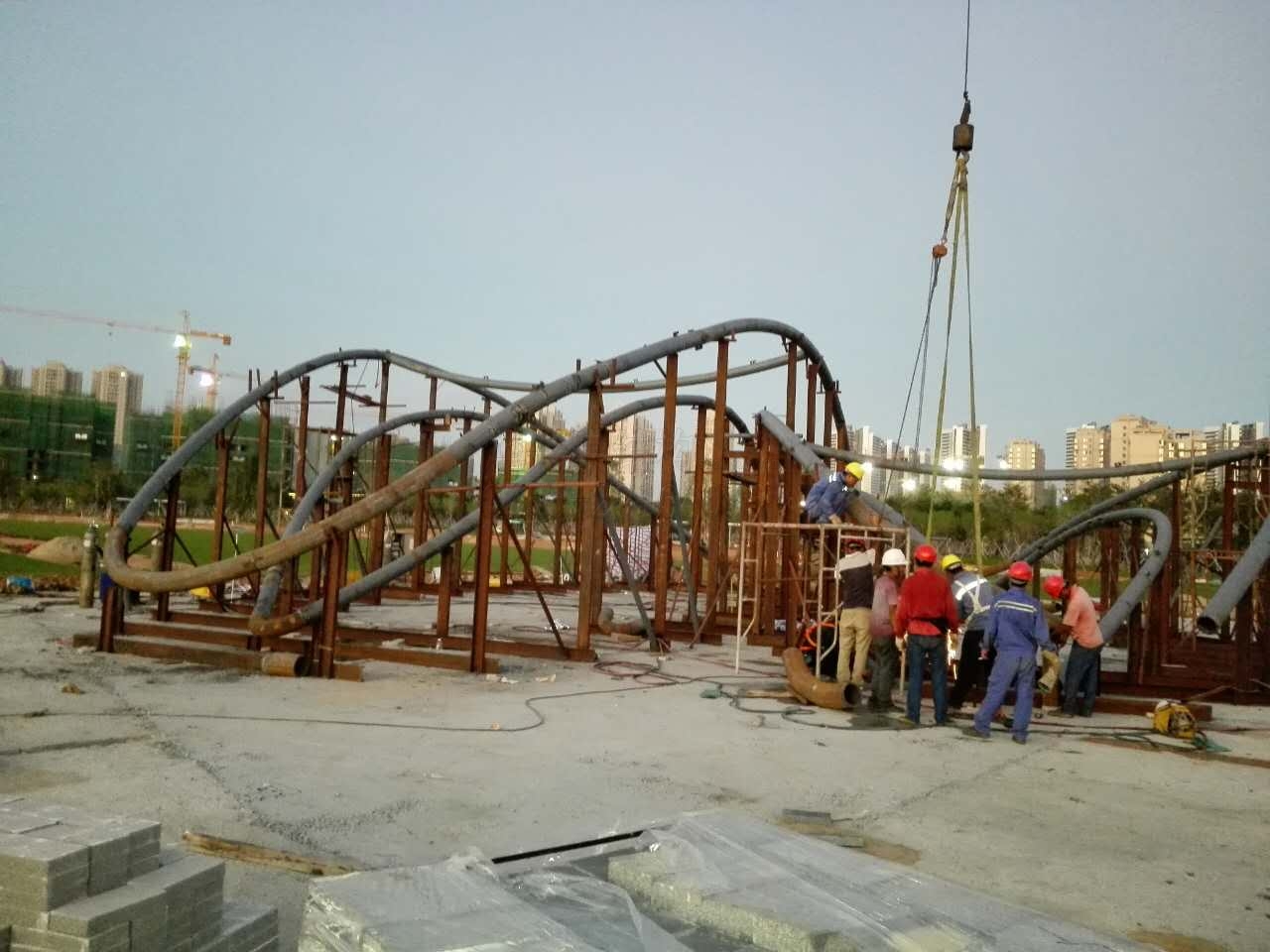 珠海金山公園膜結(jié)構(gòu)大門項目,前期工程進度不理想,主要原因是其鋼結(jié)構(gòu)部分比較復(fù)雜、工程量大,很多時間都是花在鋼構(gòu)件的預(yù)處理上面。燁興追求質(zhì)量和完美,防銹和主要的成型處理都是在專業(yè)的鋼材加工廠進行。很多業(yè)主不理解,老是抱怨為什么我們的工程進度偏慢,其實我們在看不到的地方已經(jīng)做了很多工作了。