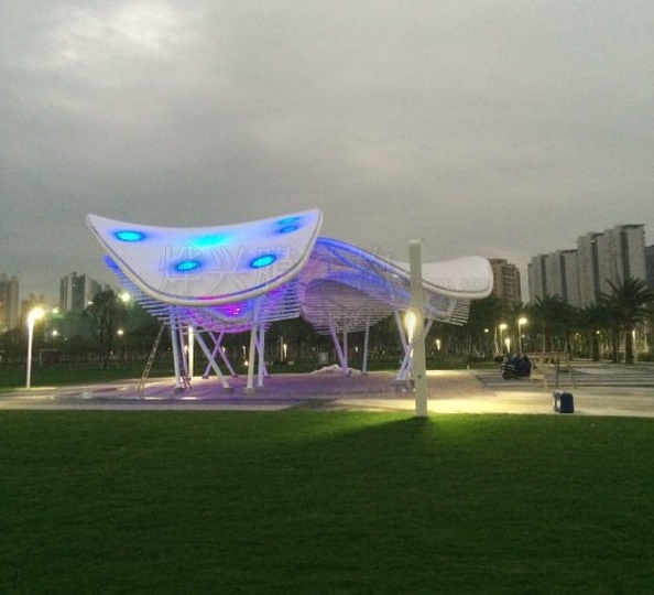 膜結(jié)構(gòu)中,張拉膜造型多變,是最具藝術(shù)表現(xiàn)力的膜結(jié)構(gòu)之一。梁祝化蝶的美麗神話,讓蝴蝶成為老少皆喜的小動(dòng)物。當(dāng)用兩只巨大而逼真的膜結(jié)構(gòu)“蝴蝶”出現(xiàn)在你樓下的花園之中,是否感覺很清新很驚艷?