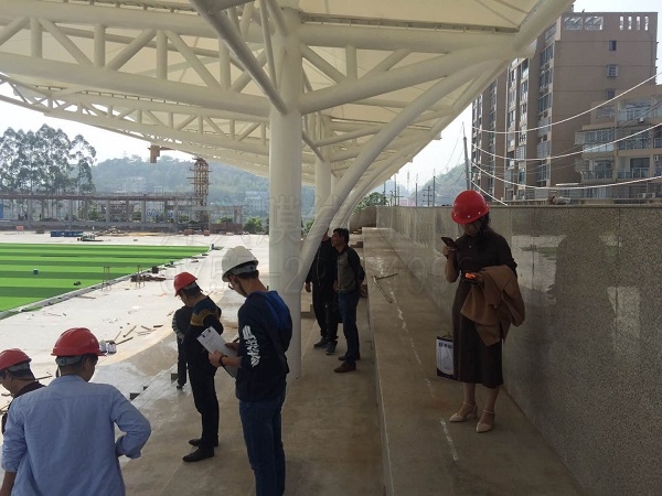 3月28日,深圳燁興膜結(jié)構(gòu)工程有限公司從本部派出設(shè)計師賴工,在現(xiàn)場項目經(jīng)理王經(jīng)理的帶領(lǐng)下,匯同業(yè)主方代表,一起對福建漳平一中膜結(jié)構(gòu)看臺項目進行檢查驗收,和往常一樣,各方代表都一致驗收通過。