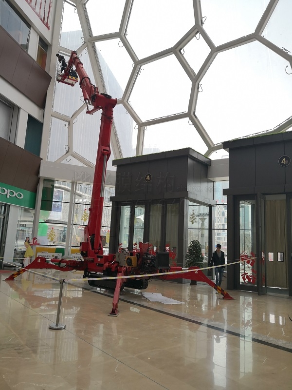上圖為工人正在操作室內(nèi)工程起降設(shè)備對ETFE室內(nèi)里面進行清潔保養(yǎng)