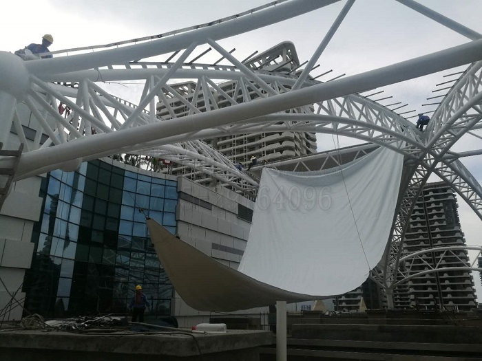 海南遠(yuǎn)大廣場3D天幕膜結(jié)構(gòu)項目是典型的商業(yè)廣場建筑,由我們燁興膜結(jié)構(gòu)設(shè)計建造,目前鋼結(jié)構(gòu)已經(jīng)安裝完成,正在進(jìn)行膜布安裝。此工程以純白色為主,粗大而精致的鋼結(jié)構(gòu)骨架撐起接近6000平方米的穹頂天幕,是由兩種高質(zhì)量的膜材按花瓣圖案依次拼接而成。厚重的鋼結(jié)構(gòu)設(shè)計及考慮了海濱城市的抗風(fēng)要素,異種膜材的拼接則讓巨大穹頂在白天時具有視覺上的層次感。