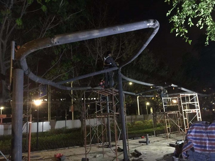 兒童公園膜結(jié)構(gòu)在設(shè)計上,既要考慮熊孩子熊爸爸的人為破壞因素,也要考慮對惡劣天氣的抵抗能力。以福永兒童公園膜結(jié)構(gòu)項目為例,考慮到深圳市是臺風(fēng)過境頻繁地區(qū),結(jié)構(gòu)上我們采用多點平衡受力的骨架式膜結(jié)構(gòu)。從現(xiàn)場的鋼構(gòu)拼裝過程我們也可以明顯看到,此次使用都是比較粗大厚重的鋼材,比一般的車棚用料標(biāo)準(zhǔn)還要高至少兩個等級,就是為了打造抗臺風(fēng)標(biāo)準(zhǔn)為14級的穩(wěn)固工程。