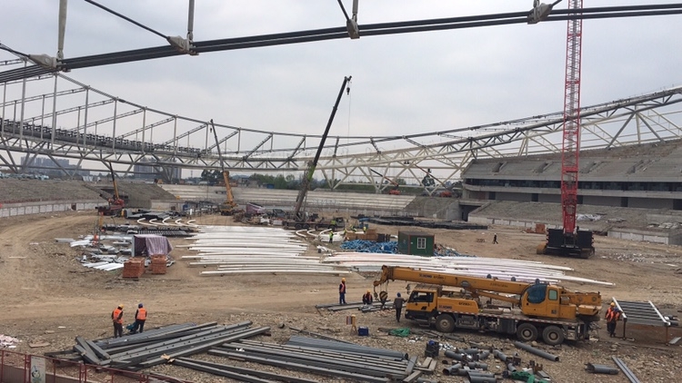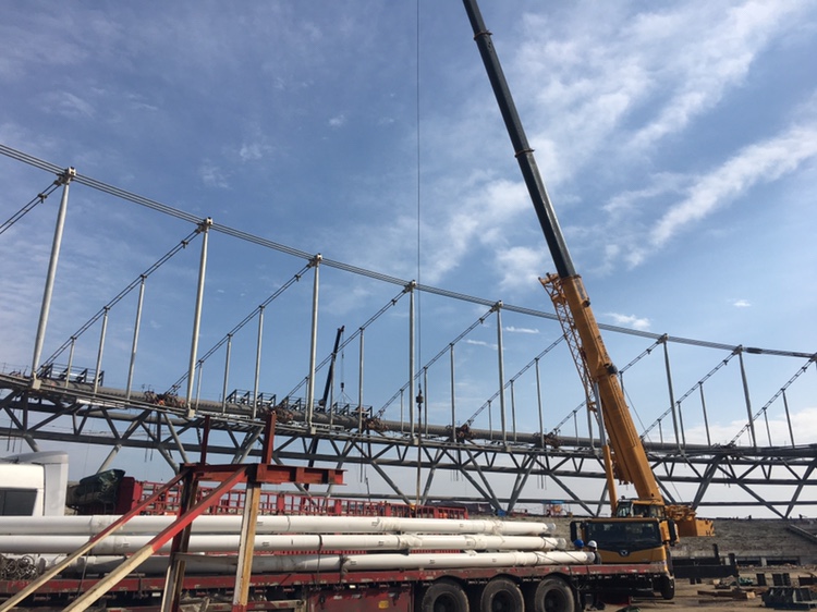 如今,樂山奧體項目懸索主體結(jié)構(gòu)已經(jīng)完工,現(xiàn)場正在吊裝固定膜材的拱桿等配件。一共210根大型拱桿,吊裝速度為20根/天,預(yù)計本月中旬能吊裝完成并調(diào)校完畢;另一方面,第一塊試裝膜材也已加工完成發(fā)往現(xiàn)場,一旦試裝成功,我們的工廠就會排出最大產(chǎn)能進行加工生產(chǎn)。場內(nèi)場外協(xié)同作業(yè),磨刀不誤砍柴工,燁興-樂山奧體膜結(jié)構(gòu)項目已經(jīng)進入高速施工的快車道,膜結(jié)構(gòu)工程預(yù)計在未來一個月內(nèi)完工!