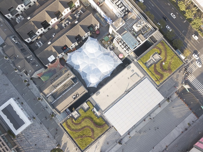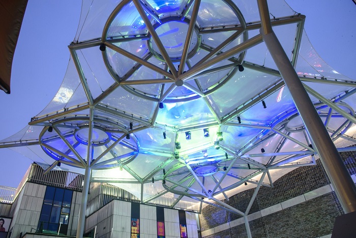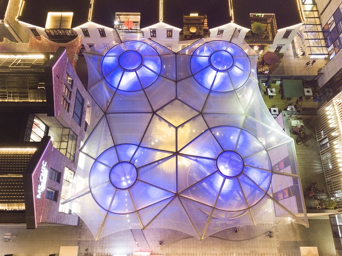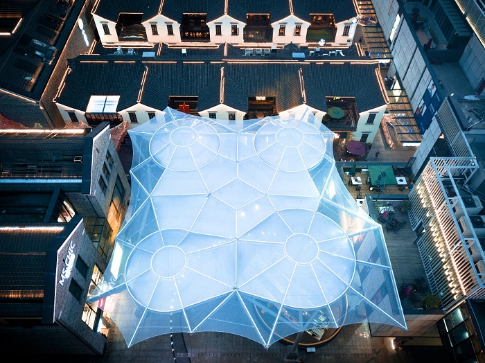 工程特點(diǎn):該項(xiàng)目是國(guó)內(nèi)首個(gè)單層ETFE加雙層氣枕膜完美嵌合的景觀雨棚建筑,利用ETFE膜材的高透光高自潔性以及雙層氣枕的隔熱能力,雨棚在具有遮陽擋雨功能的同時(shí)還可以實(shí)現(xiàn)自然采光,行人沒有傳統(tǒng)密封建筑的束縛感;另一方面,ETFE膜結(jié)構(gòu)建筑是當(dāng)代最新的建筑應(yīng)用形式之一,工程高度定制,顏值高,具有唯一性,天生自帶聚集人氣光環(huán)。