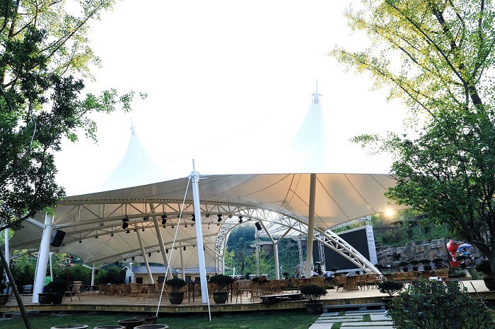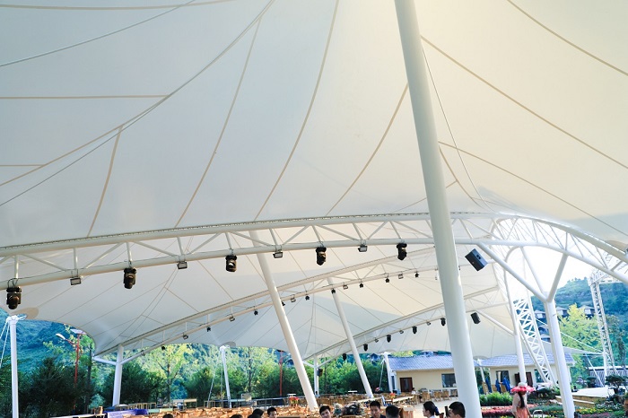梓開元芳草地鄉(xiāng)村月亮場膜結(jié)構(gòu)是由燁興膜結(jié)構(gòu)公司從設(shè)計(jì)、施工、材料等一條龍服務(wù)包干的項(xiàng)目。根據(jù)業(yè)主方要求,項(xiàng)目建成后,在特定時(shí)間將作為大型活動(dòng)的開、閉幕會(huì)場,平時(shí)則作為商業(yè)休閑廣場來運(yùn)行。項(xiàng)目在是在一個(gè)度假景區(qū)的半山腰落地,我們從安全、美觀、實(shí)用性等多方面考慮,它被設(shè)計(jì)成一個(gè)兼具旅游景觀和商業(yè)功用的綜合性膜結(jié)構(gòu)工程。如今工程已經(jīng)竣工并投入運(yùn)行,外觀效果比預(yù)期更美,為度假區(qū)內(nèi)增添了一抹亮色。