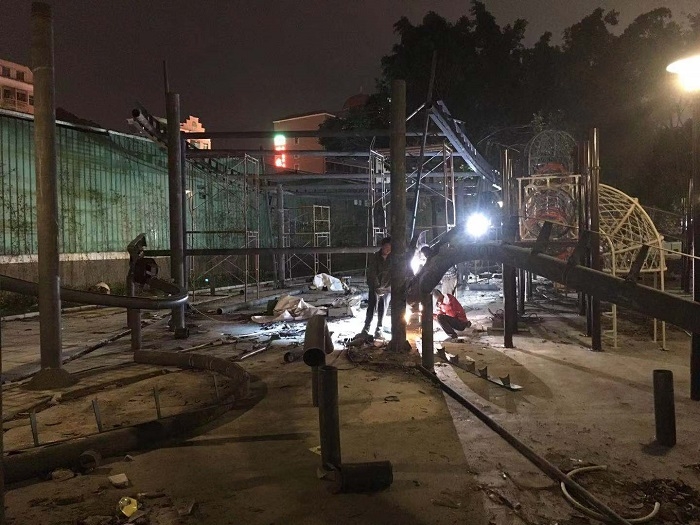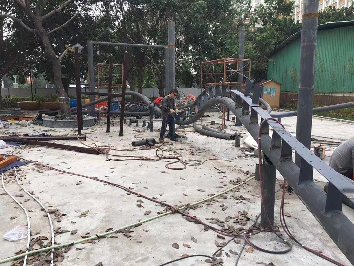 在施工方面,細(xì)節(jié)把控很重要。兒童公園這樣的場地,小孩子跑動打鬧是很頻繁的,非常容易發(fā)生碰撞或者摔倒事件。所以在施工中,我們一定要根據(jù)現(xiàn)場環(huán)境,靈巧地將支撐鋼構(gòu)融入現(xiàn)場設(shè)施中,降低支撐結(jié)構(gòu)的存在感,減少接觸面,做一些防護(hù)設(shè)施降低熊孩子的攀爬欲望。特別注意的是,現(xiàn)場鋼構(gòu)拼裝完工后,一定要檢查打磨毛刺或者其它尖銳突出點,防止觸碰受傷。